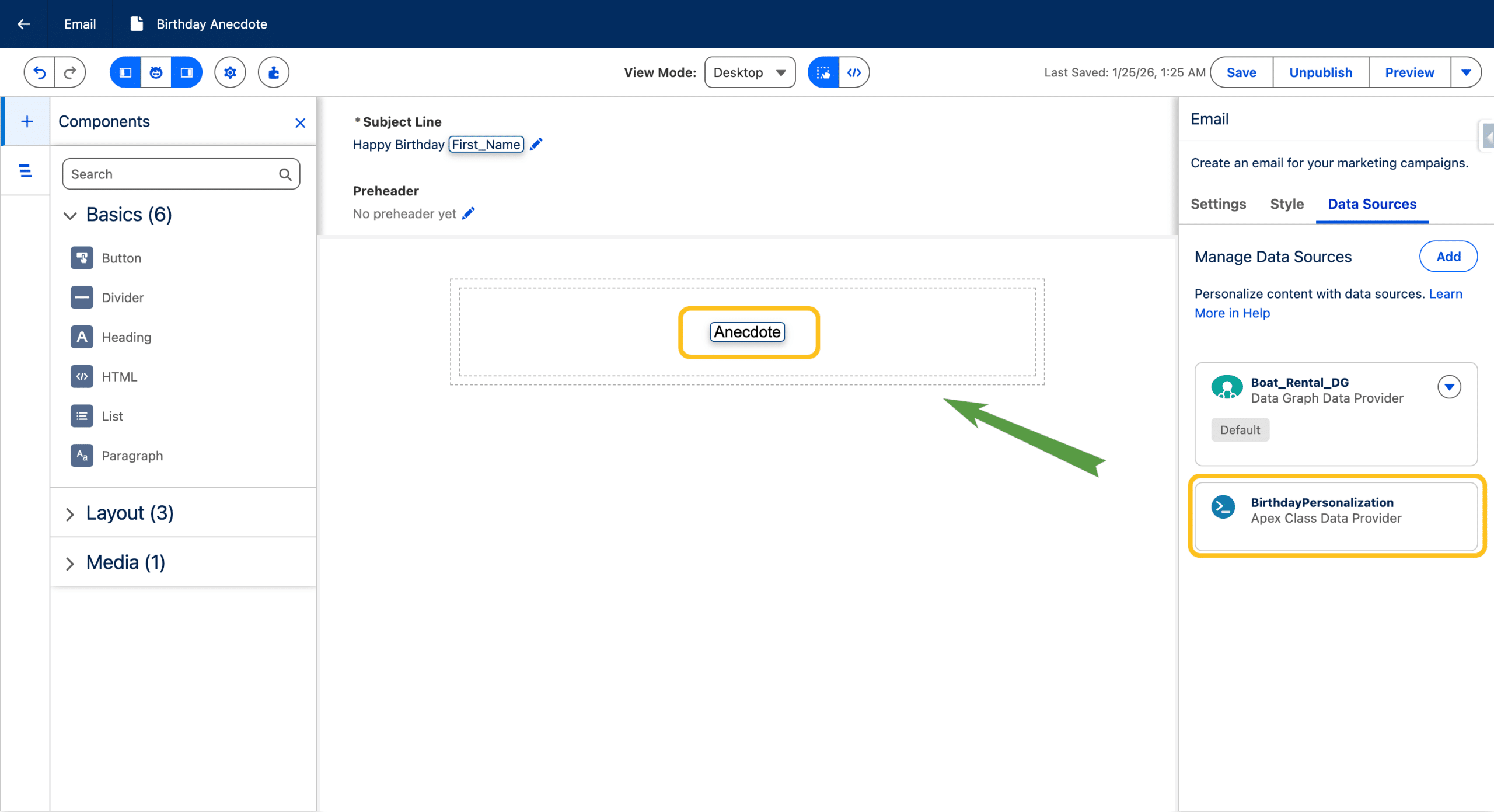 We’ll keep it very simple. In a Segment Triggered Flow, when the Segment is composed of Unified Individuals, we can use both the Data Graph and the Apex Class as a Source. So we’ll just a paragraph and a merge field to display the anecdote from the class, added as a data source from the Email Builder.