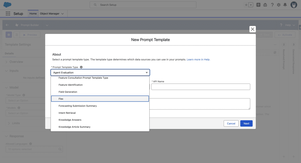 From Setup, we open Einstein > Einstein Generative AI > Prompt Builder, then +New Prompt Template.