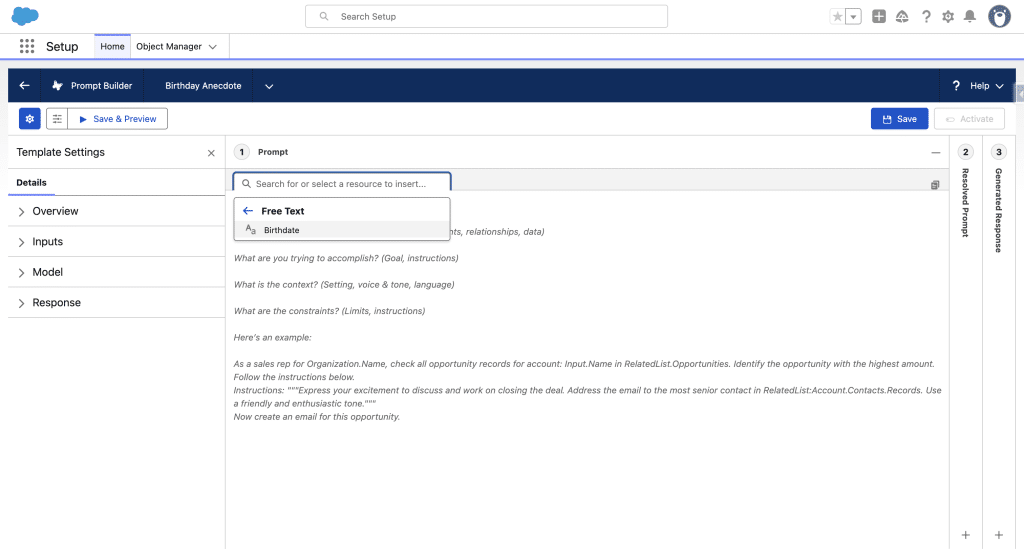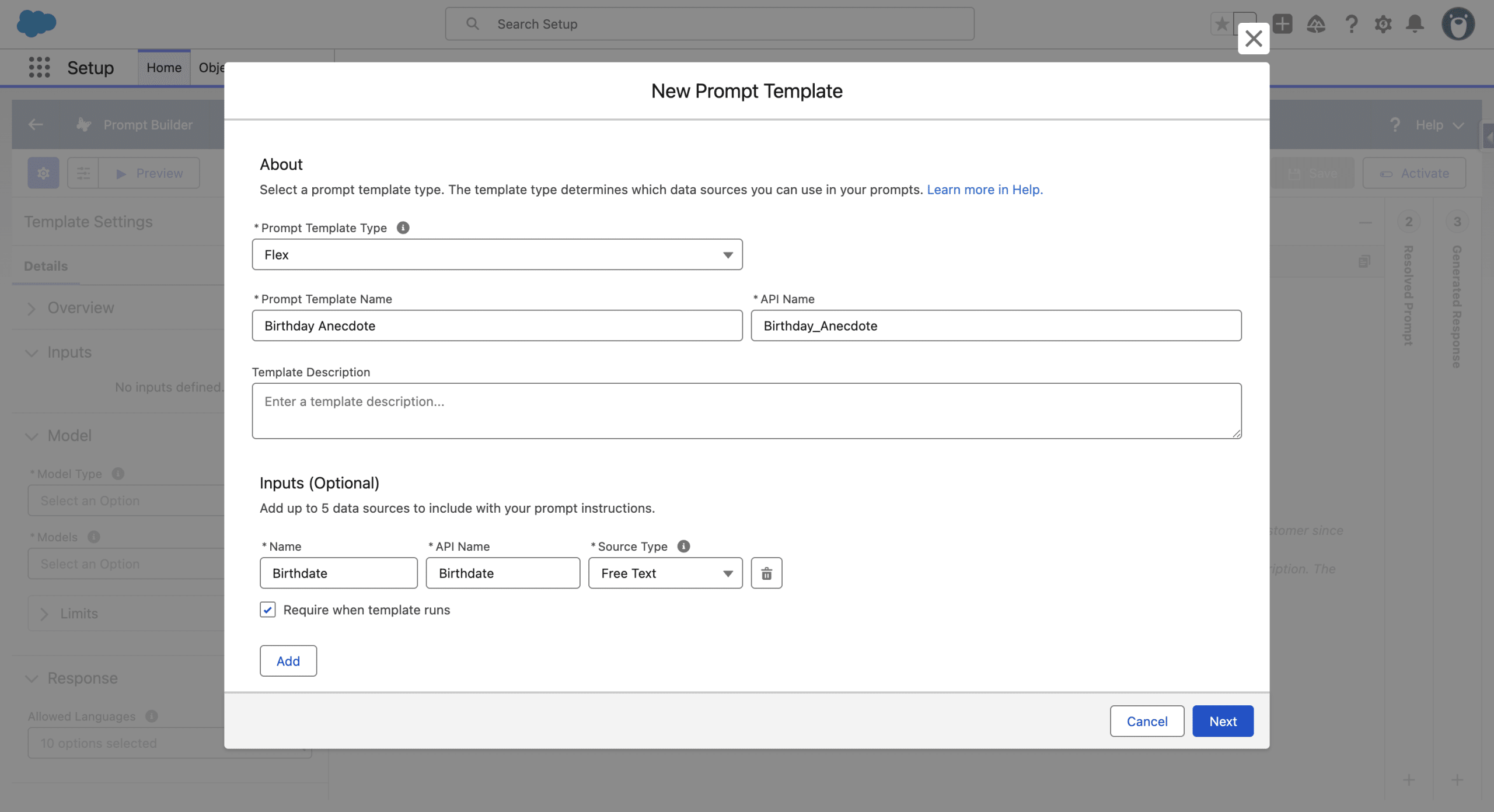 Then give it name, here Birthday Anecdote, and under Inputs (optional) we click +Add and add a Free Text and check Require when the Template runs. We could add much more input data, or even retrieve data directly from the Flex Prompt to ground the Prompt to the recipient’s data. For our example, we’ll just the Contact’s bith date from the Flow.