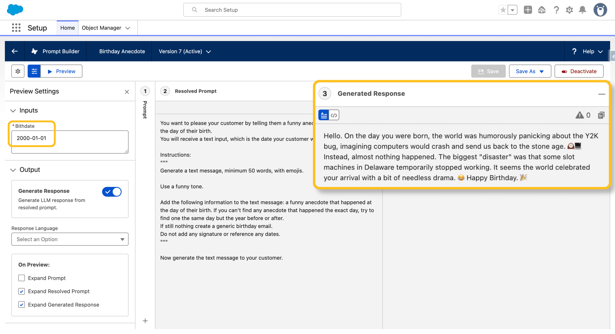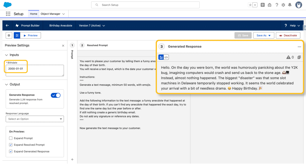 Once the Prompt outputs the expected results in Preview, we can +Activate it.