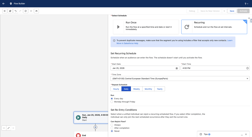 We’ll use a recurring Segment Triggered Flow. We define the Start Date and Time. As a Repeat Schedule, we’ll use Daily (Note, since Spring ’26 we can schedule hourly Flows), run it every day and select Never for Can Rejoin Flow as we want to send the anecdote only one time to our customers.