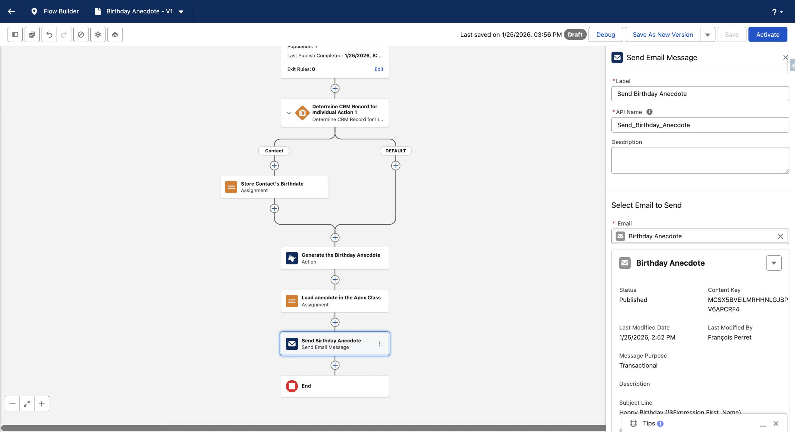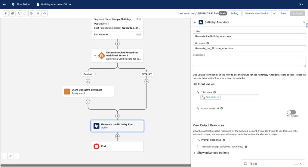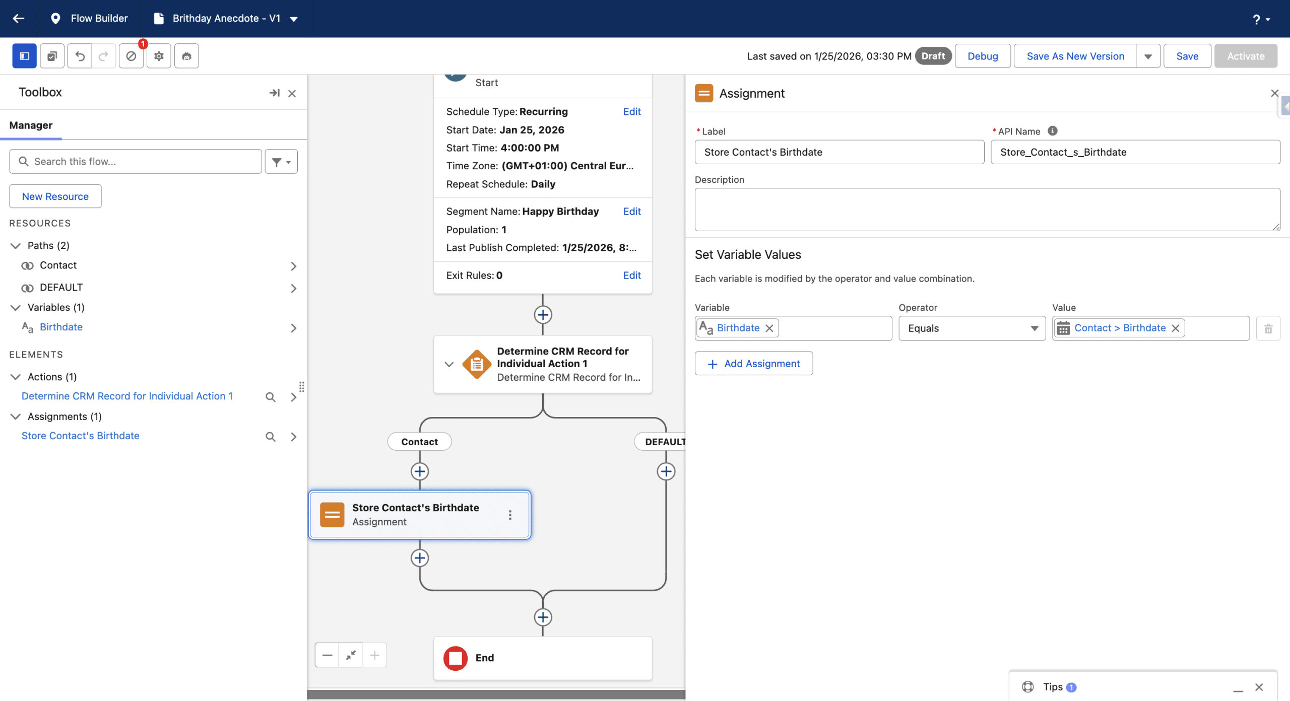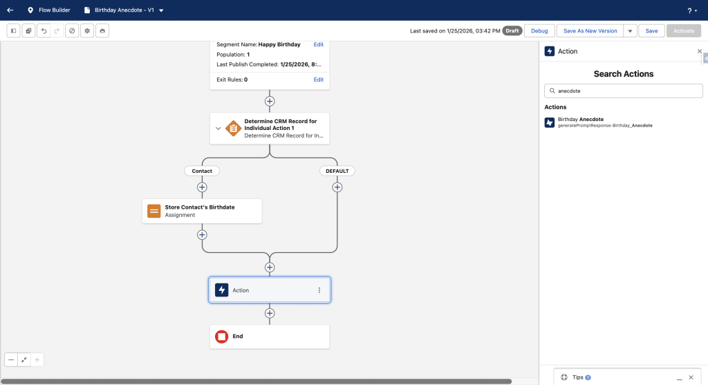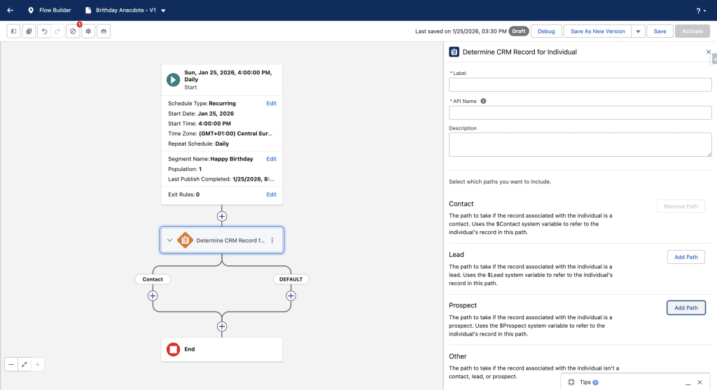 By design our Segment has at least one Contact whose birthday is today. We’ll get it by adding a Determine CRM Record for individual element in the Flow. We will only keep a Contact branch.
