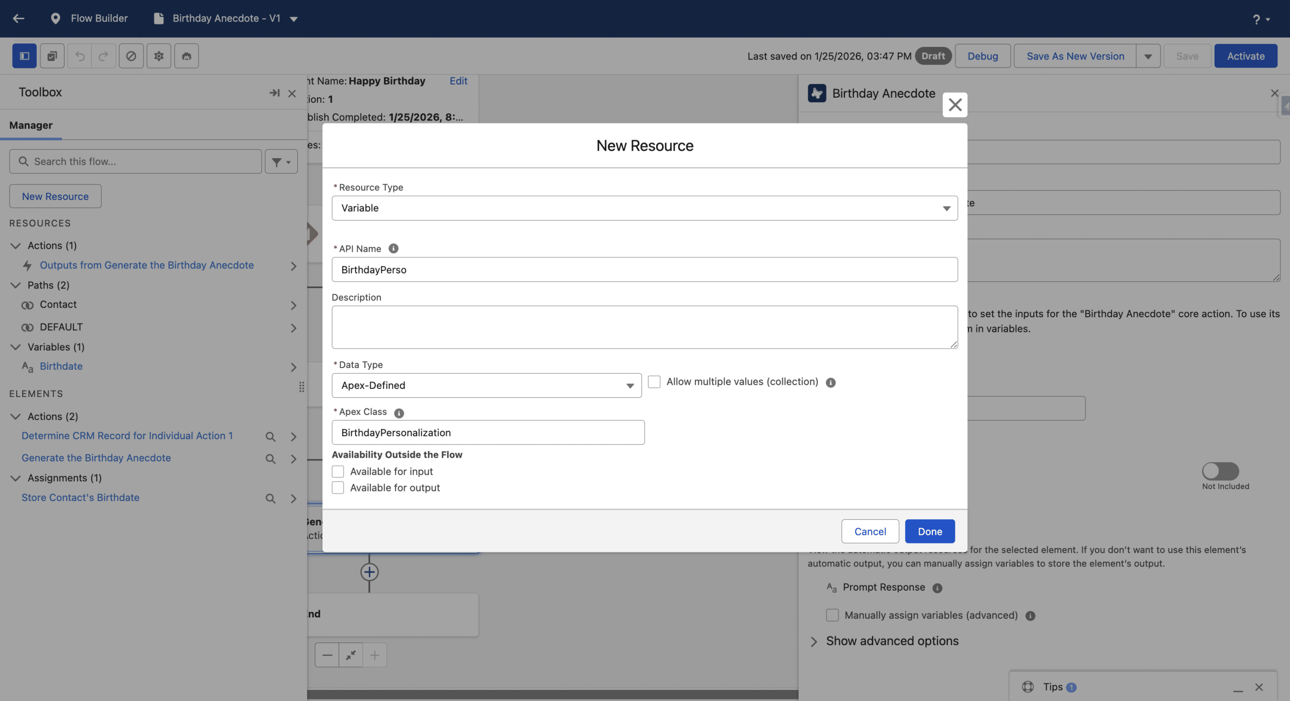 The content stored in the Class, generated by the Flex Prompt, will only exist in the Flow and we won’t store in a Field in the data model, albeit this can be done, for debug reasons for example or simply to analyse what has been sent.