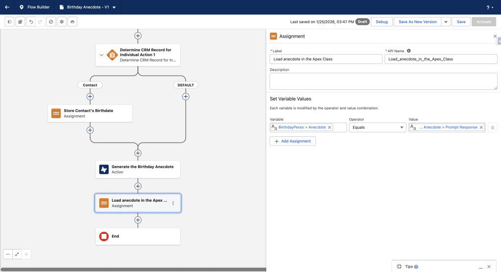 We now add a new Assignement activity in the Flow to load the value in class, so that the Email can use it. The value is the Prompt Response of the output of the previous Flex Prompt Template.